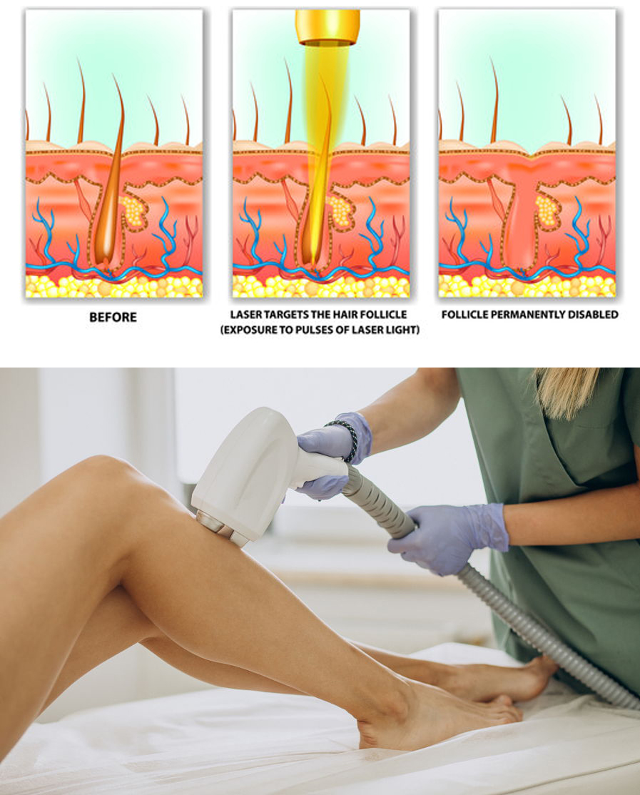 The synergic benefits of the 3 most effective wavelengths for hair removal, each targeting different structures within the hair follicle, namely the bulge, bulb & papilla.